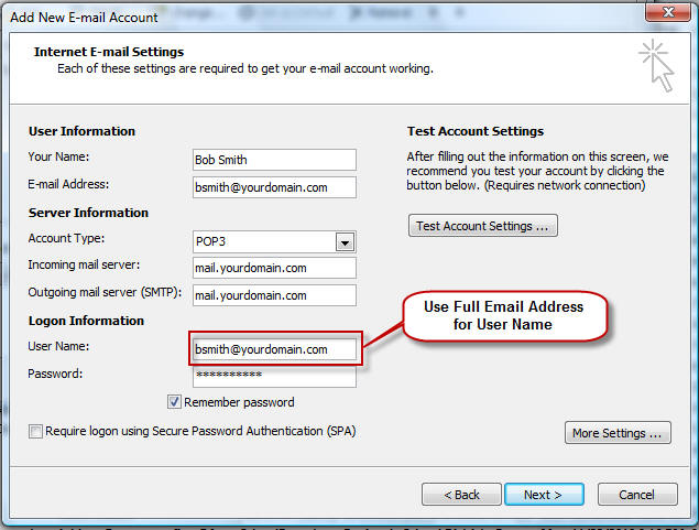 Outgoing (SMTP) Server: mail.yourdomain.com