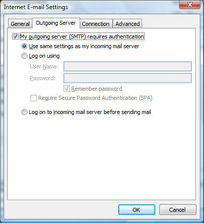 On the "Outgoing Server" tab, check to see that the fields are configured as shown below.